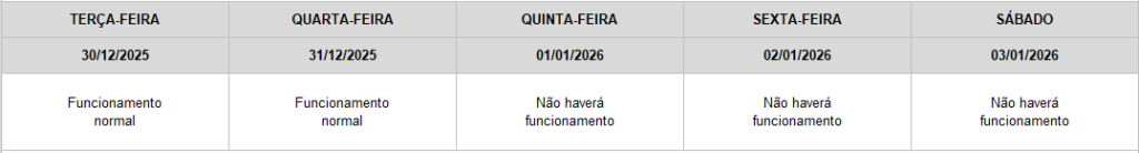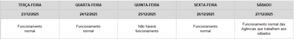 Brasília – Em razão dos feriados de Fim de Ano, não haverá atendimento nas agências dos Correios nos dias 25/12/2025 (Natal) e 1º/1/2026 (Confraternização Universal). As unidades vão operar conforme tabela a seguir: