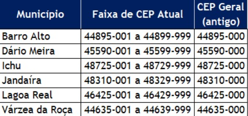 Salvador – Os Correios concluíram os projetos de codificação postal dos municípios de Barro Alto, Dário Meira, Ichu, Jandaíra, Lagoa Real e Várzea da Roça. Agora, as localidades possuem Códigos de Endereçamento Postal (CEPs) específicos para seus logradouros. Isto é, cada avenida, praça, rua e travessa tem identificação individual.