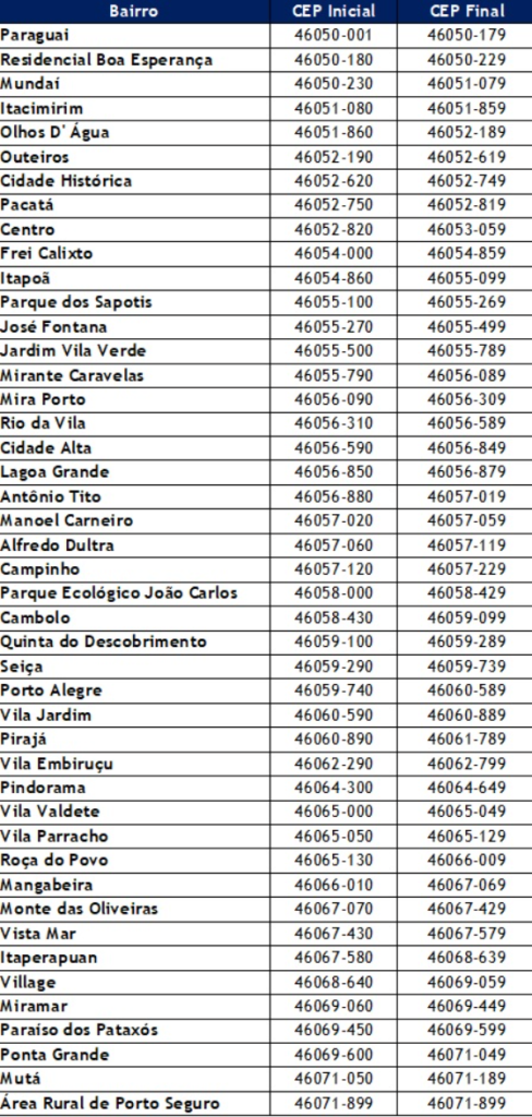 As faixas dos distritos de Porto Seguro foram alteradas: Vera Cruz (46095-000 a 46095-999), Arraial D’Ajuda (46096-000 a 46096-999), Vale Verde (46097-000 a 46097-999), Trancoso (46098-000 a 46098-999) e Caraíva (46099-000 a 46099-999).